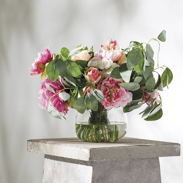 Stunningly beautiful, this 15.5"Hx23"W Silk Peony Flower & Rosemary Arrangement with Glass Vase in Cerise/Pink resembles that fresh cut flowers look and includes the shown glass vase. Designed with high quality silk flowers, this gorgeous artificial flower centerpiece will look stunning wherever it's displayed. It's the perfect piece if you're looking to add some effortless beauty to your space. Have fresh blooms here with no wilting or watering.
