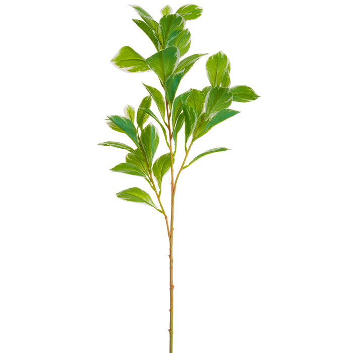 Stunningly beautiful, this 26.5" Silk Evergreen Japonica Leaf Stem in Variegated would be perfect for all types of floral arrangements or to add a splash of green to tabletops and office desks. Get the potted plant effect by placing a bunch of these in a pot by the window or use the leaves in a bouquet to add some green relief to the colorful flowers. Our high-quality materials will keep your greenery stems and leaves looking fresh and vibrant for many years, and they'll never need a drop of water.