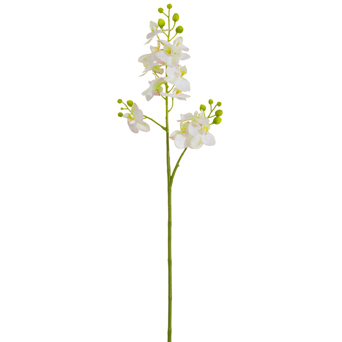 Stunningly beautiful, this 27.5" Mini Silk Phalaenopsis Orchid Flower Stem in White adds an elegant, high-end look to arrangements with graceful blooms that work as instant focal points. Use this stem in mixed bouquets, wedding florals, spa-inspired designs or simple vase arrangements, either on its own or combined with other faux flowers and greenery for a polished, upscale feel.