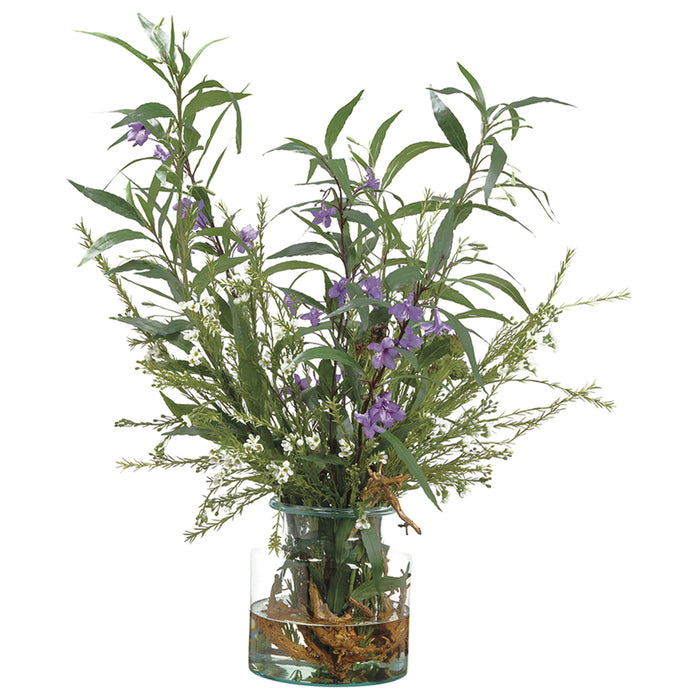 36" Silk Ruellia Flower & Rosemary Arrangement w/Glass Vase -Purple/Green