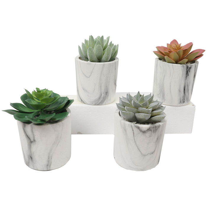 4.75" Set Of Assorted Succulent Artificial Plants w/Fake Marble Pots -Green/Burgundy