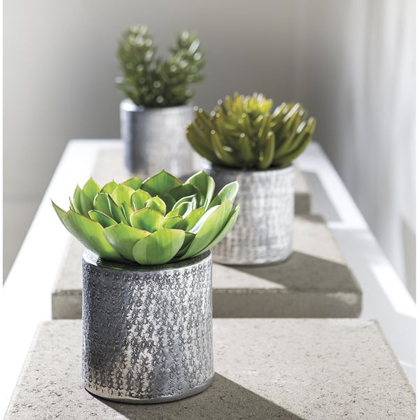 Stunningly beautiful, this 8" Artificial Echeveria Succulent Plant with Aluminum Pot in 2 Tone Green would look amazing displayed anywhere in your home. Infuse a gorgeous summery vibe into the aesthetic of your residence or office with this stunningly striking faux succulent plant. Exquisitely designed with only the finest quality materials and with painstaking attention to detail, this beautiful creation looks so natural that folks will think that it is real. And thanks to it's natural realism, you can thoroughly enjoy the enhancement it'll bring to any space without the need of maintaining it at all. A beautiful realistic plant that is timeless.